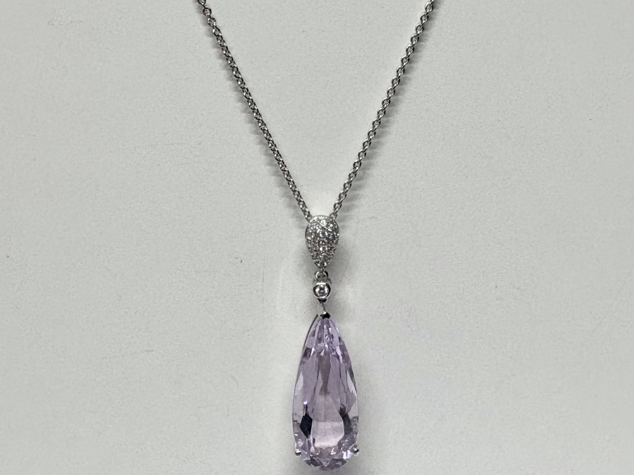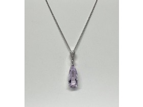 Elongated pear cut Amethyst measuring 4.95ct with round brilliant cut diamonds on the Bails. Set in 9ct white gold. This pendant comes with a 9ct white gold chain measuring 18",