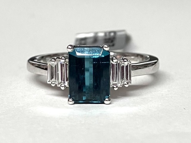 Rectangle cut 1.38ct upper fine Blue Tourmaline with a two baguette cut diamonds on each shoulder measuring .32ct in total. 18ct white gold ring size N. Other sizes can be made available. please enquire