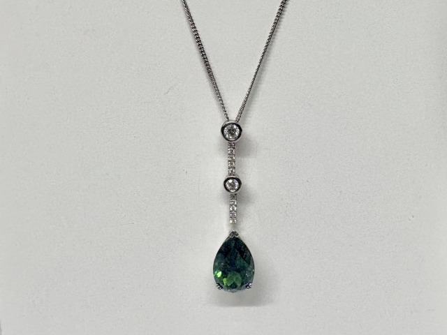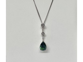 Pear cut Chrome tourmaline measuring 4.10ct and twelve round brilliant cut diamonds totalling .27ct set in 18ct white gold. This pendant comes with a 18" 18ct white gold chain, should you require an alternate length or style, please contact us.