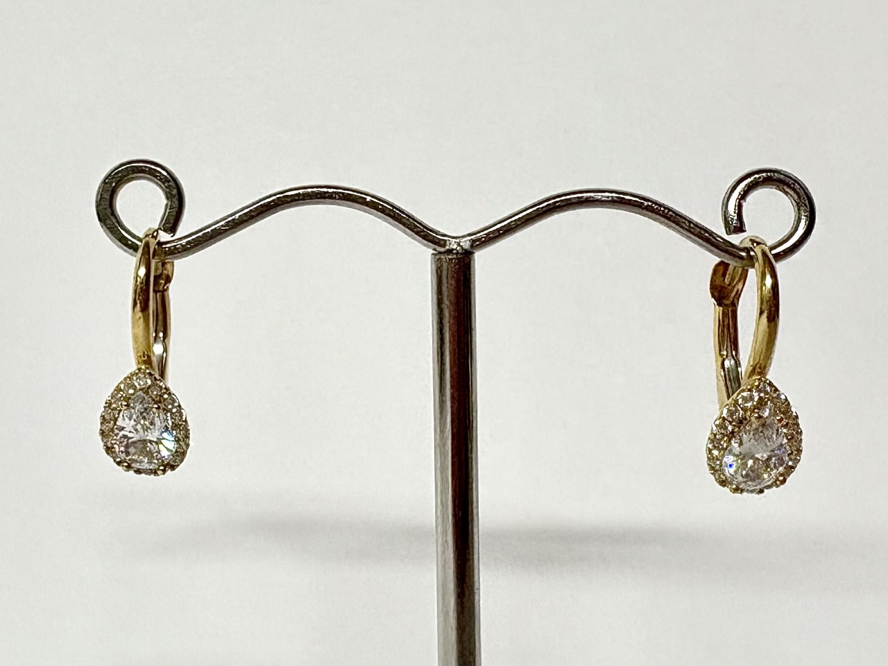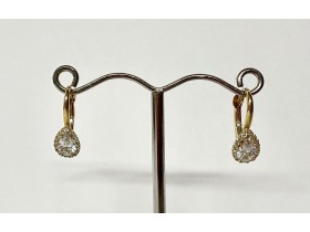9ct yellow gold hoop earrings. set with a pear shape cubic zirconia and multiple cubic zirconia stones surrounding it, with a hinge fastening.