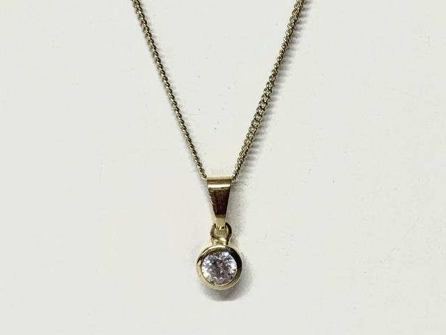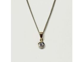 A Cubic Zirconia set in 9ct yellow gold. This pendant comes with a standard 18" filed curb chain, should you require an alternate length or style, please contact us.