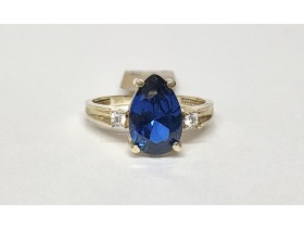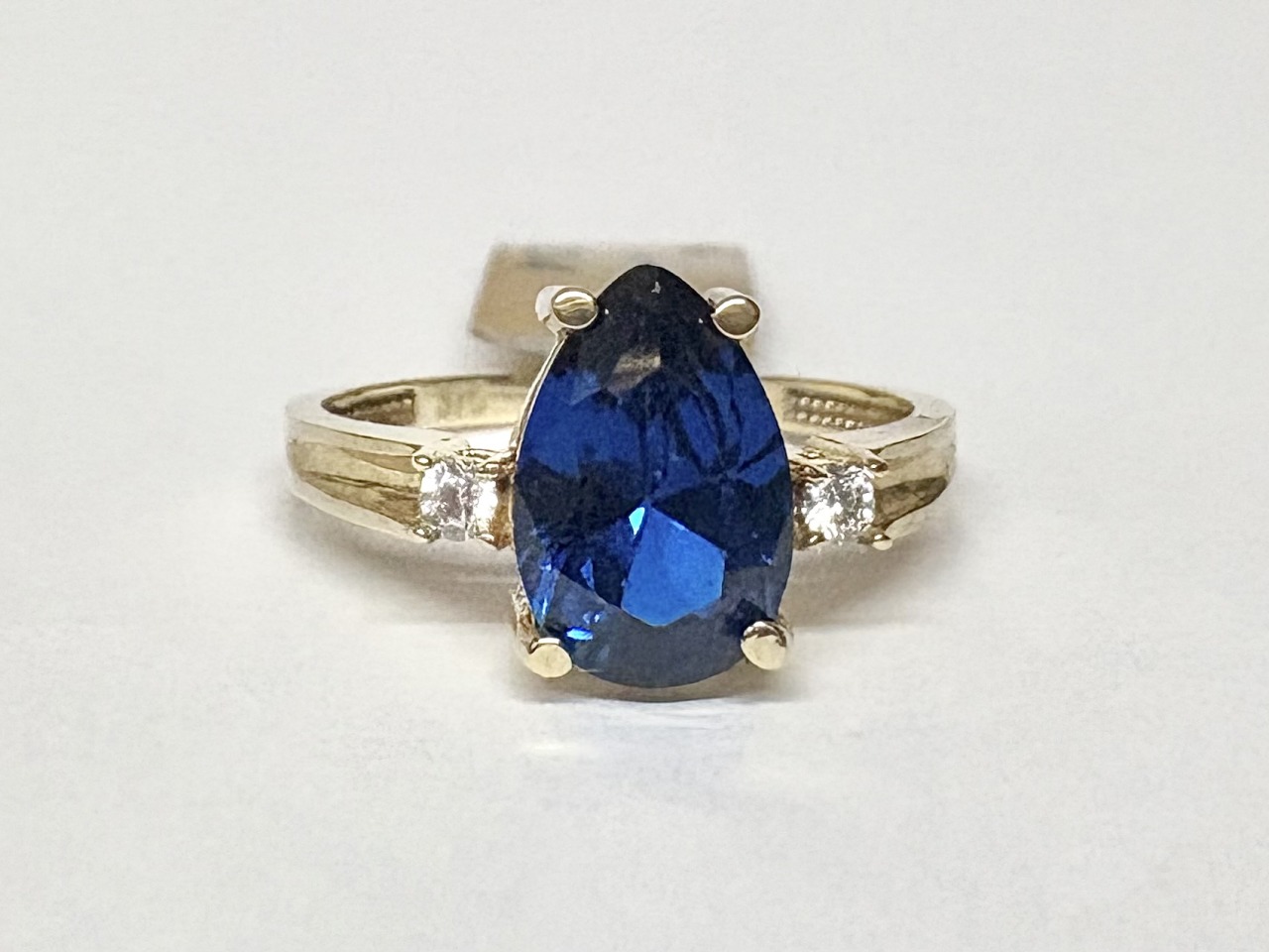 Pear cut blue CZ with a white round cut CZ on each shoulder. This ring is currently available in 9ct yellow gold but can be made to order in all other metals. Should you require an alternative size, please contact us.
