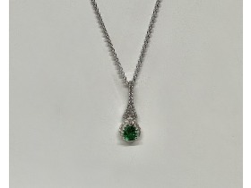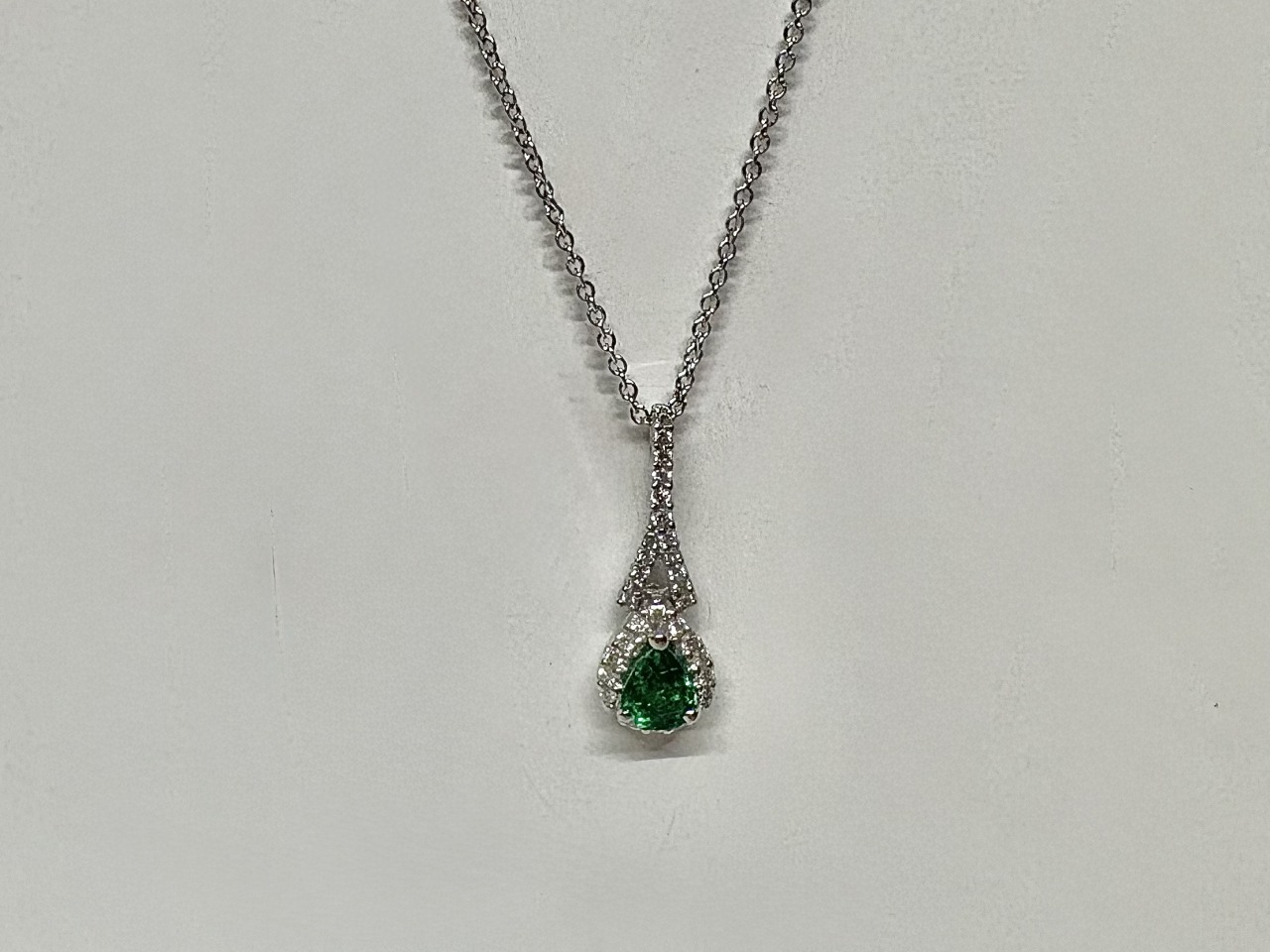 Pear cut Emerald surrounded by round brilliant cut diamonds. Set in 18ct white gold. This pendant comes with a 18ct white gold chain measuring 16"