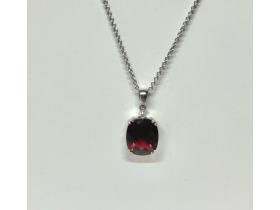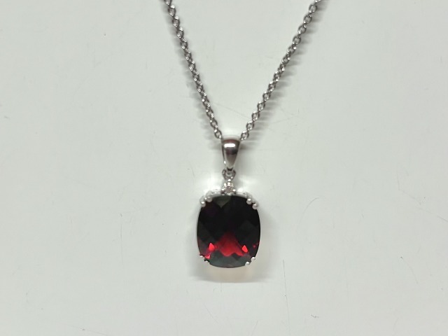Cushion cut garnet and diamond set in 18ct white gold. This pendant comes with a standard 16" filed curb chain, should you require an alternate length or style, please contact us.