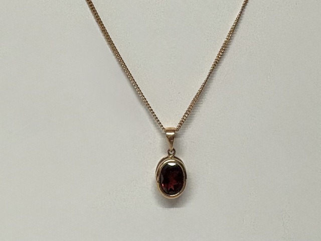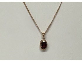 Oval cut Garnet set in 18ct rose gold. This pendant comes with a 18ct rose gold chain measuring 18"