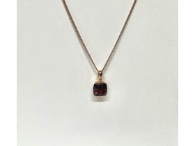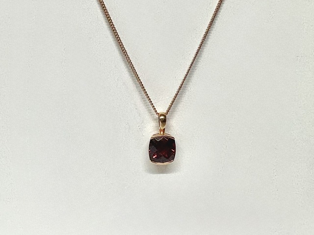 Cushion cut Garnet. Set in 18ct rose gold. The price includes an 18" 18ct rose gold chain.