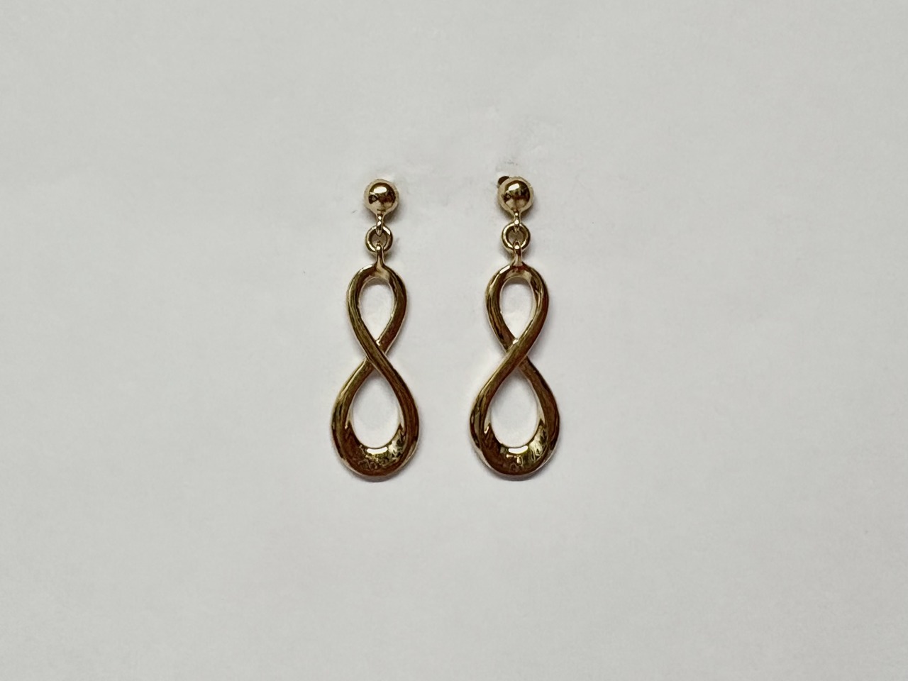 9ct yellow gold infinity earrings. Measuring 2cm in height and 0.7cm in width at its widest point. Fitted with ball and posts and butterfly's.