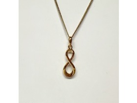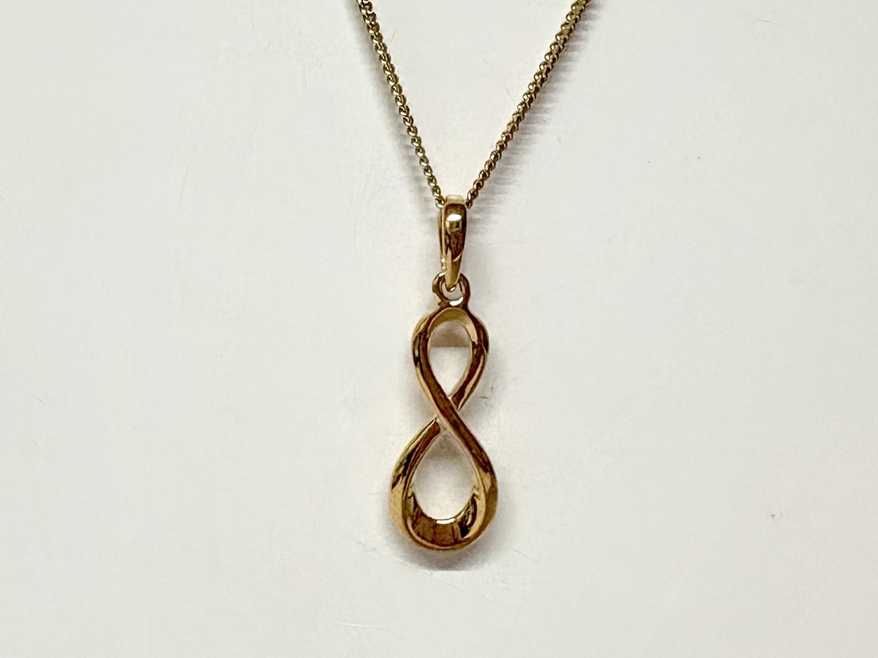 9ct yellow gold infinity pendant. Measuring 2cm in height not including the bail and 0.7cm in width at its widest point. This pendant comes on a 18" 9ct yellow gold standard chain.