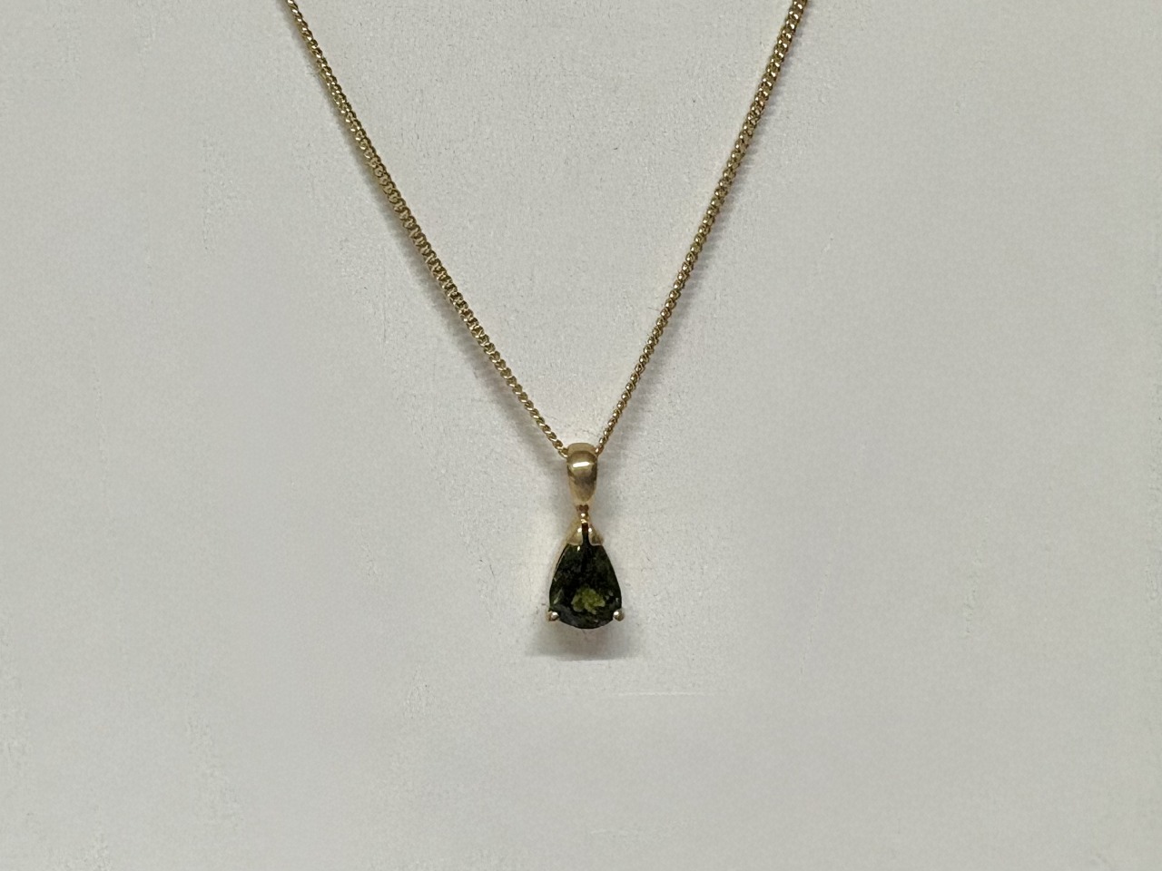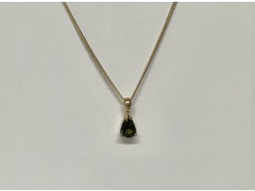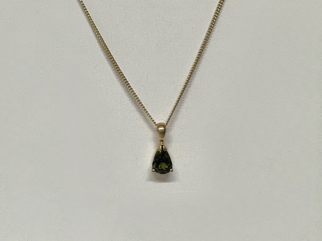 Pear cut green tourmaline set in 9ct yellow gold. This pendant comes with an 18" 9ct yellow gold filed curb chain, should you require an alternate length or style, please contact us.
