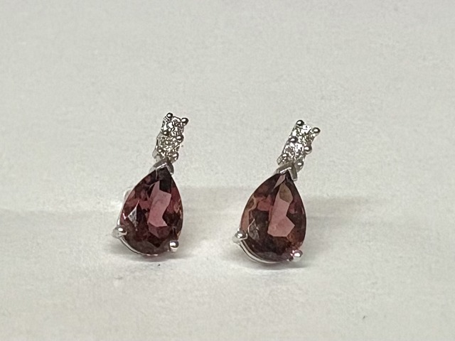 Pear cut pink tourmaline with two round brilliant cut diamonds in each drop. Set in 18ct White Gold with post & butterfly fittings.