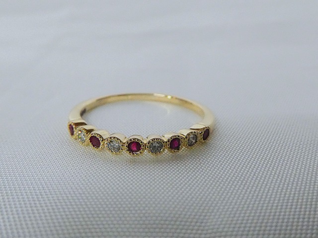 Milligrain bezzle set alternating four Diamonds totalling .08ct and five rubies.9ct yellow gold ring size P. Other sizes can be made available. please enquire
