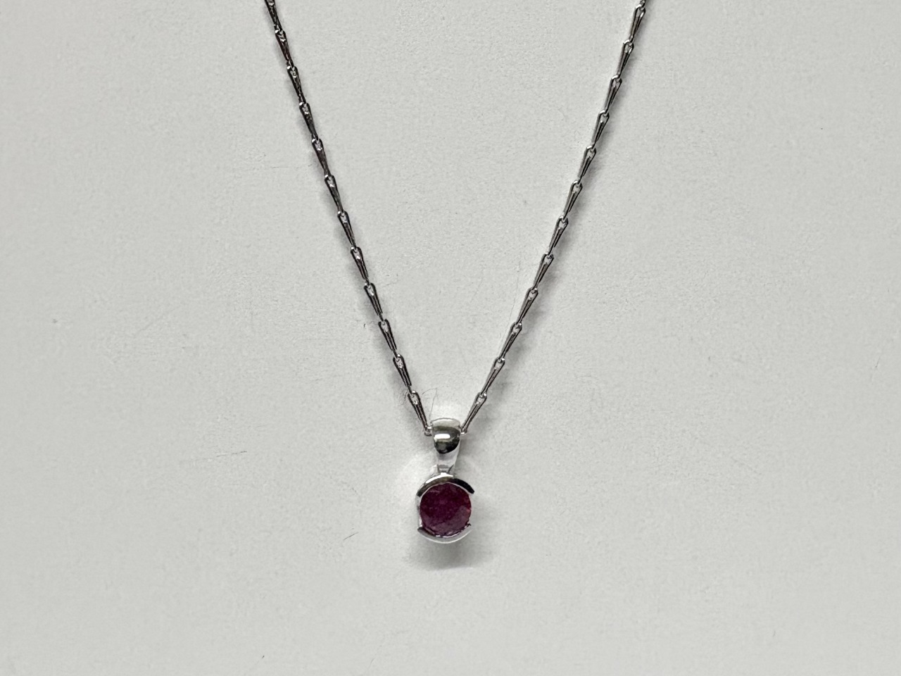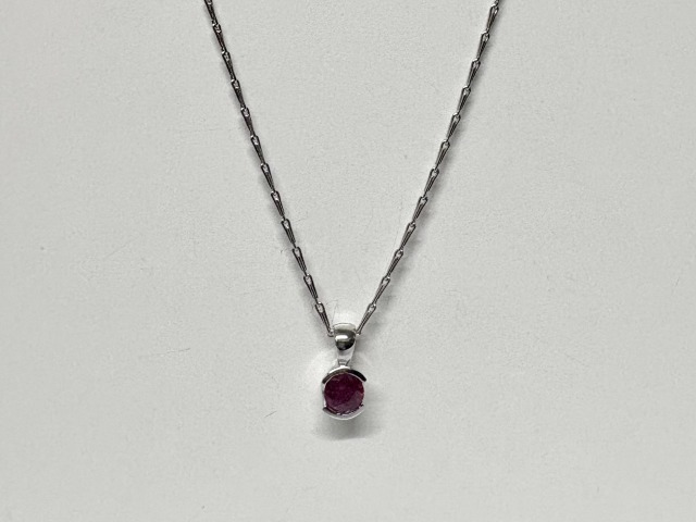 Ruby Set in 18ct white gold. This pendant comes with an 16" 18ct white gold chain, should you require an alternate length or style, please contact us.