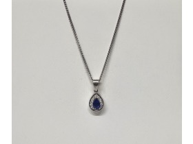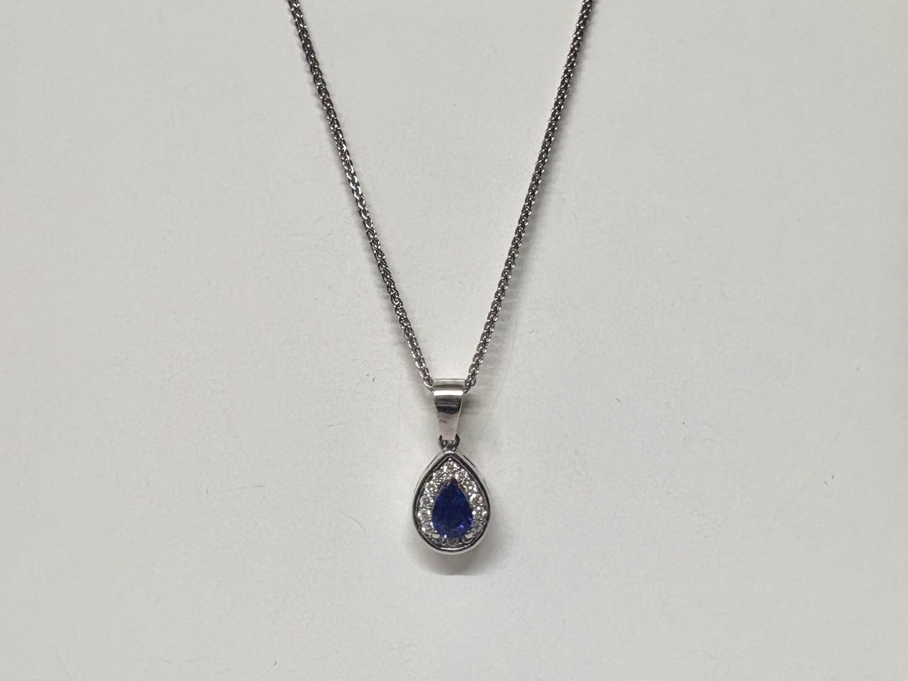 Pear shape .48ct Sapphire surrounded by round brilliant cut diamonds totalling .15ct. Set in 18ct white gold. 18ct white gold chain measuring 18", should you require an alternate length or style, please contact us.