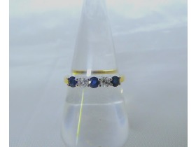 Three round cut sapphire stones and two round brilliant cut diamonds measuring .20ct in total. This ring is currently available in 9ct yellow gold but can be made to order in all other metals. Should you require an alternative size, please contact us.