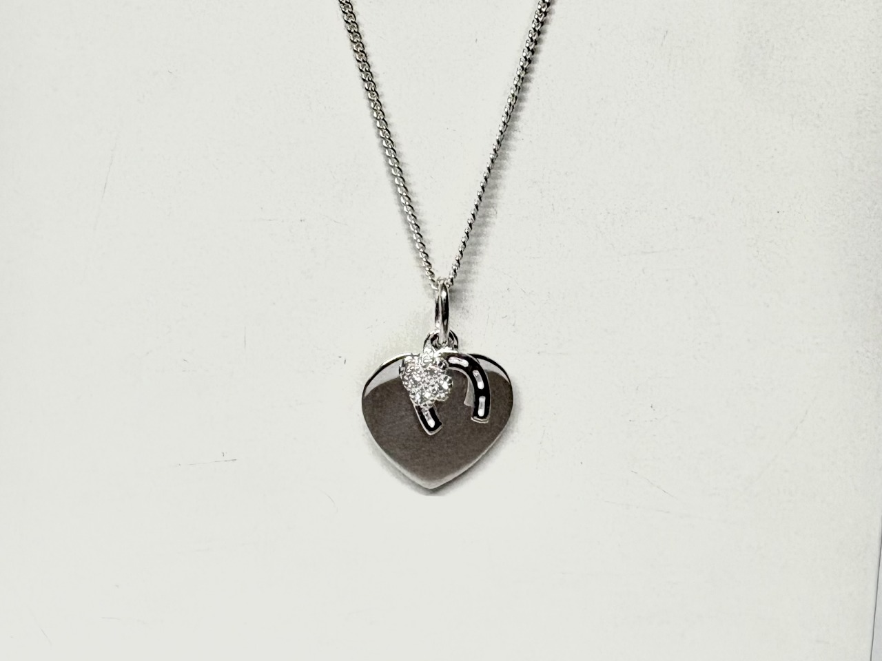 Silver heart pendant with a horseshoe set with cubic zirconia stones.