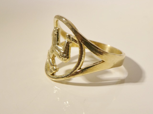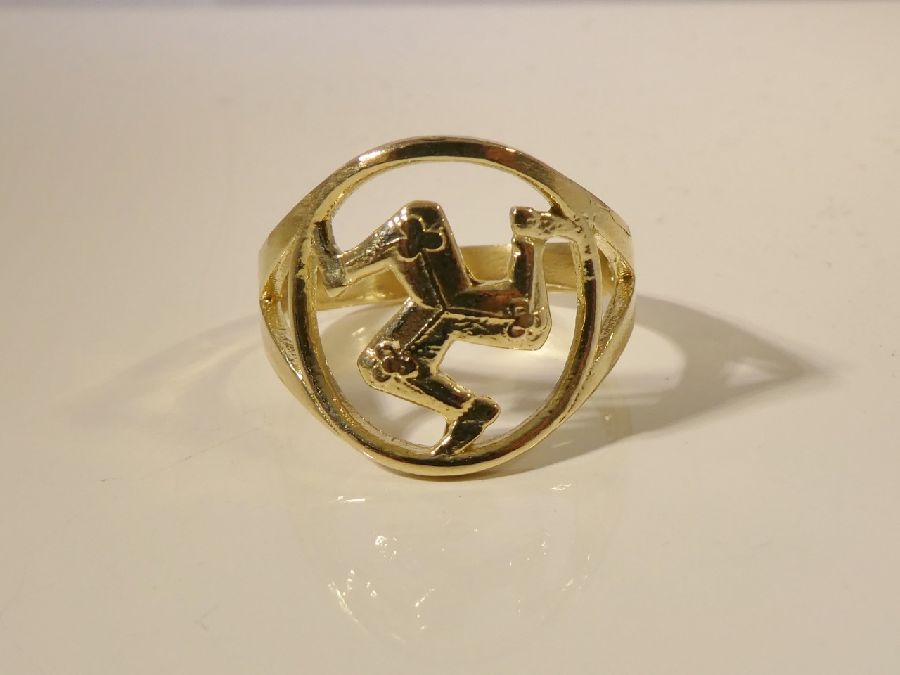 The three legs is the symbol of the Isle of Man, it's latin motto translates to "whichever way you throw me I stand". This ring has an open front to it and measures 15mm at its widest reducing to 3mm around the back.