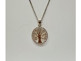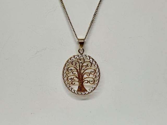 9ct yellow and white gold tree of life pendant. Measuring 1.7cm in width and 2cm in height not including the bail. This pendant comes on a standard 18" 9ct yellow gold chain.