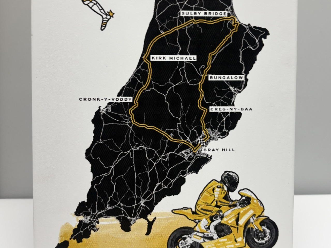 Ceramic tile depicting IOM TT measuring 30cm in height and 20cm in width. This tile can be hooked on the wall or propped up with its built in wooden stands.